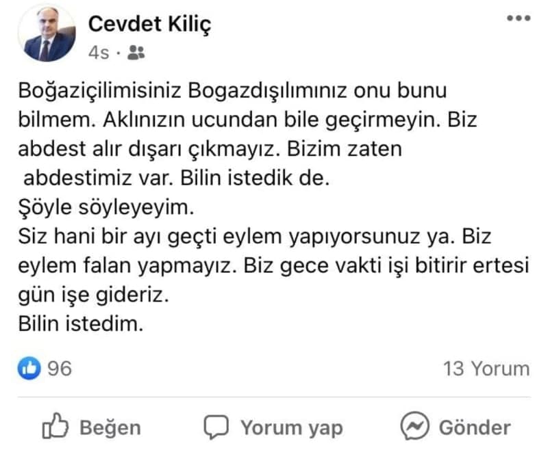 Facebook hesabından Boğaziçi eylemlerini ve öğrencileri hedef alan Kılıç, “Biz eylem falan yapmayız. Biz gece vakti işi bitirir ertesi gün işe gideriz” sözlerini paylaşarak tehdit etti.