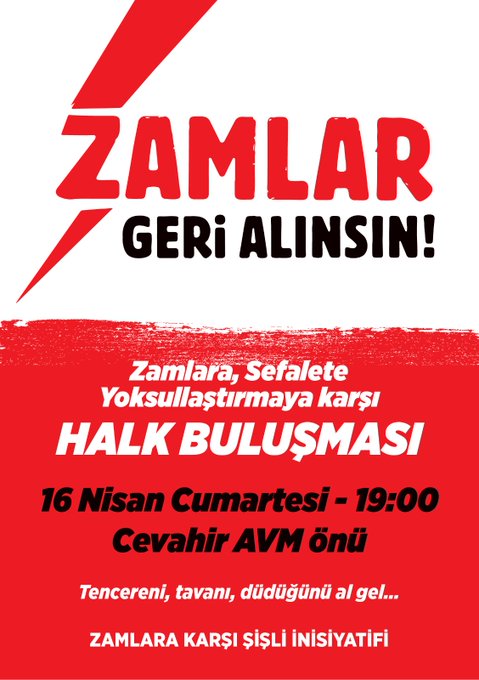 İSTANBUL – Zamlara Karşı Şişli İnsiyatifi, 16 Nisan Cuma günü saat 19.00’da tencere, düdük ve bilumum ses çıkaran araç ve gereçleri ile Cevahir AVM önünde buluşuyor.